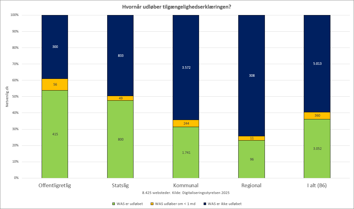 I tallene kan vi desuden se, at offentligretlige websteder faktisk er endnu dårligere stillet: 415 af 771 websteder har ikke en gyldig webtilgængelighedserklæring, og 56 erklæringer er højst 30 dage fra at overskride skæringsdatoen.